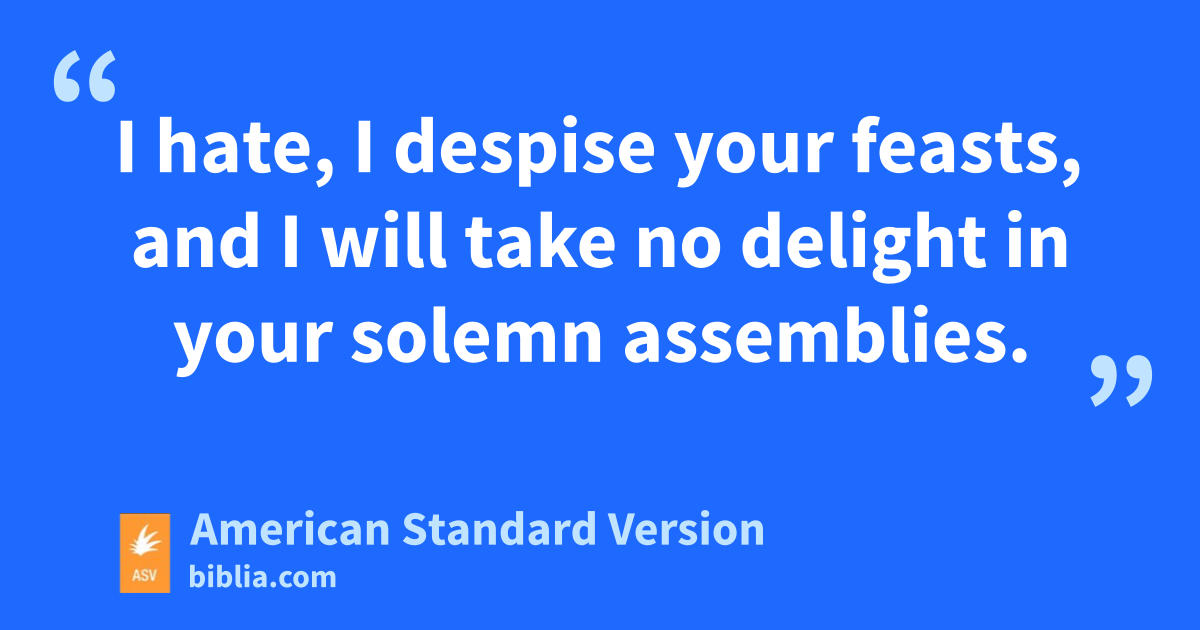 21I hate, I despise your feasts, and I will take no delight in your solemn assemblies. 22Yea, though ye offer me your burnt-offerings and meal-offerings, I will not accept them; neither will I regard the peace-offerings of your fat beasts. 23Take thou away from me the noise of thy songs; for I will not hear the melody of thy viols. 24But let justice roll down as waters, and righteousness as a mighty stream.