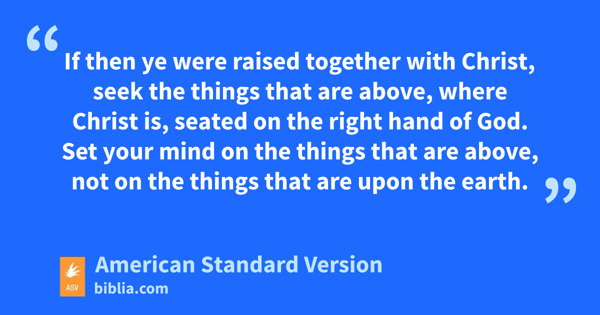 3 If then ye were raised together with Christ, seek the things that are above, where Christ is, seated on the right hand of God. 2Set your mind on the things that are above, not on the things that are upon the earth. 3For ye died, and your life is hid with Christ in God. 4When Christ, who is our life, shall be manifested, then shall ye also with him be manifested in glory.