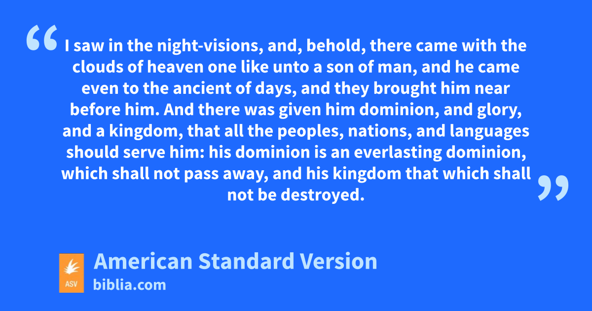 13I saw in the night-visions, and, behold, there came with the clouds of heaven one like unto a son of man, and he came even to the ancient of days, and they brought him near before him. 14And there was given him dominion, and glory, and a kingdom, that all the peoples, nations, and languages should serve him: his dominion is an everlasting dominion, which shall not pass away, and his kingdom that which shall not be destroyed.