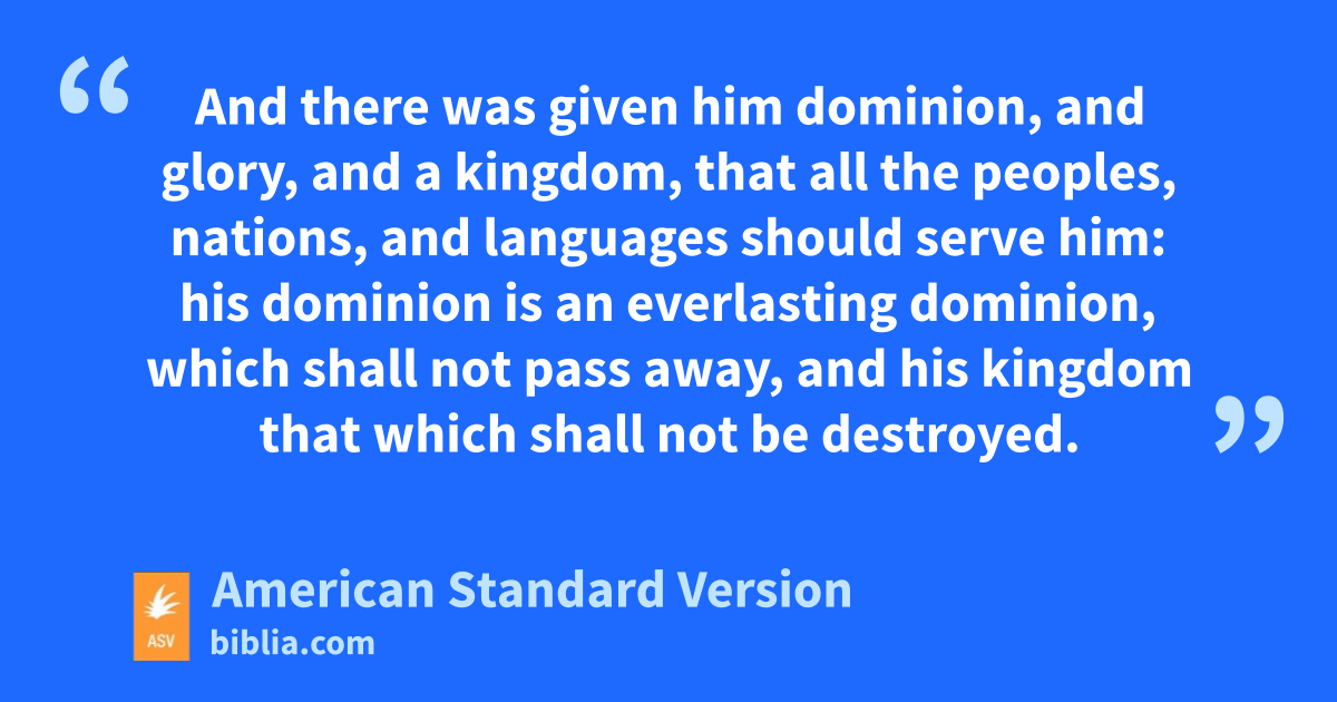 13I saw in the night-visions, and, behold, there came with the clouds of heaven one like unto a son of man, and he came even to the ancient of days, and they brought him near before him. 14And there was given him dominion, and glory, and a kingdom, that all the peoples, nations, and languages should serve him: his dominion is an everlasting dominion, which shall not pass away, and his kingdom that which shall not be destroyed.