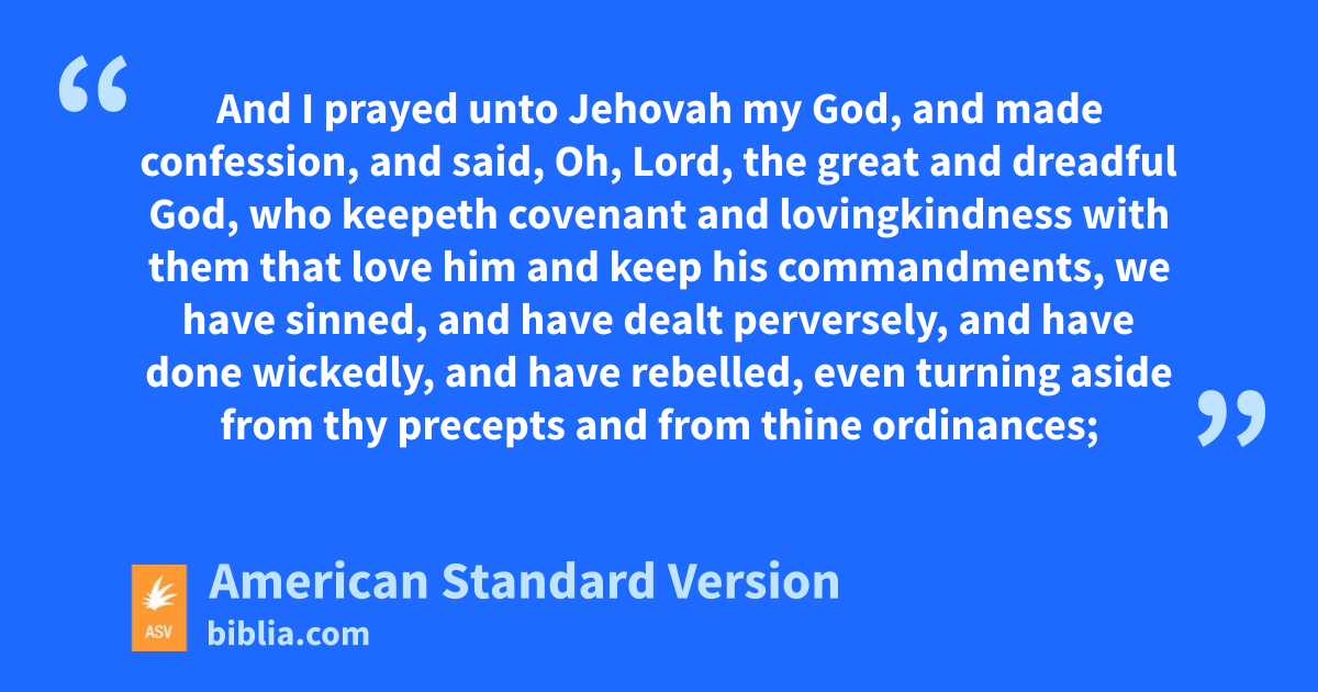 3And I set my face unto the Lord God, to seek by prayer and supplications, with fasting and sackcloth and ashes. 4And I prayed unto Jehovah my God, and made confession, and said, Oh, Lord, the great and dreadful God, who keepeth covenant and lovingkindness with them that love him and keep his commandments, 5we have sinned, and have dealt perversely, and have done wickedly, and have rebelled, even turning aside from thy precepts and from thine ordinances; 6neither have we hearkened unto thy servants the prophets, that spake in thy name to our kings, our princes, and our fathers, and to all the people of the land. 7O Lord, righteousness belongeth unto thee, but unto us confusion of face, as at this day; to the men of Judah, and to the inhabitants of Jerusalem, and unto all Israel, that are near, and that are far off, through all the countries whither thou hast driven them, because of their trespass that they have trespassed against thee. 8O Lord, to us belongeth confusion of face, to our kings, to our princes, and to our fathers, because we have sinned against thee. 9To the Lord our God belong mercies and forgiveness; for we have rebelled against him; 10neither have we obeyed the voice of Jehovah our God, to walk in his laws, which he set before us by his servants the prophets. 11Yea, all Israel have transgressed thy law, even turning aside, that they should not obey thy voice: therefore hath the curse been poured out upon us, and the oath that is written in the law of Moses the servant of God; for we have sinned against him. 12And he hath confirmed his words, which he spake against us, and against our judges that judged us, by bringing upon us a great evil; for under the whole heaven hath not been done as hath been done upon Jerusalem. 13As it is written in the law of Moses, all this evil is come upon us: yet have we not entreated the favor of Jehovah our God, that we should turn from our iniquities, and have discernment in thy truth. 14Therefore hath Jehovah watched over the evil, and brought it upon us; for Jehovah our God is righteous in all his works which he doeth, and we have not obeyed his voice. 15And now, O Lord our God, that hast brought thy people forth out of the land of Egypt with a mighty hand, and hast gotten thee renown, as at this day; we have sinned, we have done wickedly. 16O Lord, according to all thy righteousness, let thine anger and thy wrath, I pray thee, be turned away from thy city Jerusalem, thy holy mountain; because for our sins, and for the iniquities of our fathers, Jerusalem and thy people are become a reproach to all that are round about us. 17Now therefore, O our God, hearken unto the prayer of thy servant, and to his supplications, and cause thy face to shine upon thy sanctuary that is desolate, for the Lord’s sake. 18O my God, incline thine ear, and hear; open thine eyes, and behold our desolations, and the city which is called by thy name: for we do not present our supplications before thee for our righteousnesses, but for thy great mercies’ sake. 19O Lord, hear; O Lord, forgive; O Lord, hearken and do; defer not, for thine own sake, O my God, because thy city and thy people are called by thy name.