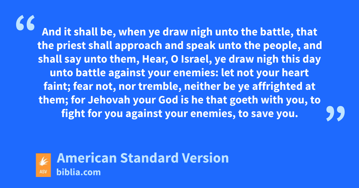 20 When thou goest forth to battle against thine enemies, and seest horses, and chariots, and a people more than thou, thou shalt not be afraid of them; for Jehovah thy God is with thee, who brought thee up out of the land of Egypt. 2And it shall be, when ye draw nigh unto the battle, that the priest shall approach and speak unto the people, 3and shall say unto them, Hear, O Israel, ye draw nigh this day unto battle against your enemies: let not your heart faint; fear not, nor tremble, neither be ye affrighted at them; 4for Jehovah your God is he that goeth with you, to fight for you against your enemies, to save you. 5And the officers shall speak unto the people, saying, What man is there that hath built a new house, and hath not dedicated it? let him go and return to his house, lest he die in the battle, and another man dedicate it. 6And what man is there that hath planted a vineyard, and hath not used the fruit thereof? let him go and return unto his house, lest he die in the battle, and another man use the fruit thereof. 7And what man is there that hath betrothed a wife, and hath not taken her? let him go and return unto his house, lest he die in the battle, and another man take her. 8And the officers shall speak further unto the people, and they shall say, What man is there that is fearful and fainthearted? let him go and return unto his house, lest his brethren’s heart melt as his heart. 9And it shall be, when the officers have made an end of speaking unto the people, that they shall appoint captains of hosts at the head of the people.