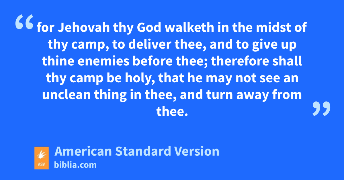 9When thou goest forth in camp against thine enemies, then thou shalt keep thee from every evil thing. 10If there be among you any man, that is not clean by reason of that which chanceth him by night, then shall he go abroad out of the camp, he shall not come within the camp: 11but it shall be, when evening cometh on, he shall bathe himself in water; and when the sun is down, he shall come within the camp. 12Thou shalt have a place also without the camp, whither thou shalt go forth abroad: 13and thou shalt have a paddle among thy weapons; and it shall be, when thou sittest down abroad, thou shalt dig therewith, and shalt turn back and cover that which cometh from thee: 14for Jehovah thy God walketh in the midst of thy camp, to deliver thee, and to give up thine enemies before thee; therefore shall thy camp be holy, that he may not see an unclean thing in thee, and turn away from thee.