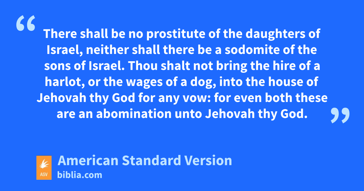 17There shall be no prostitute of the daughters of Israel, neither shall there be a sodomite of the sons of Israel. 18Thou shalt not bring the hire of a harlot, or the wages of a dog, into the house of Jehovah thy God for any vow: for even both these are an abomination unto Jehovah thy God.