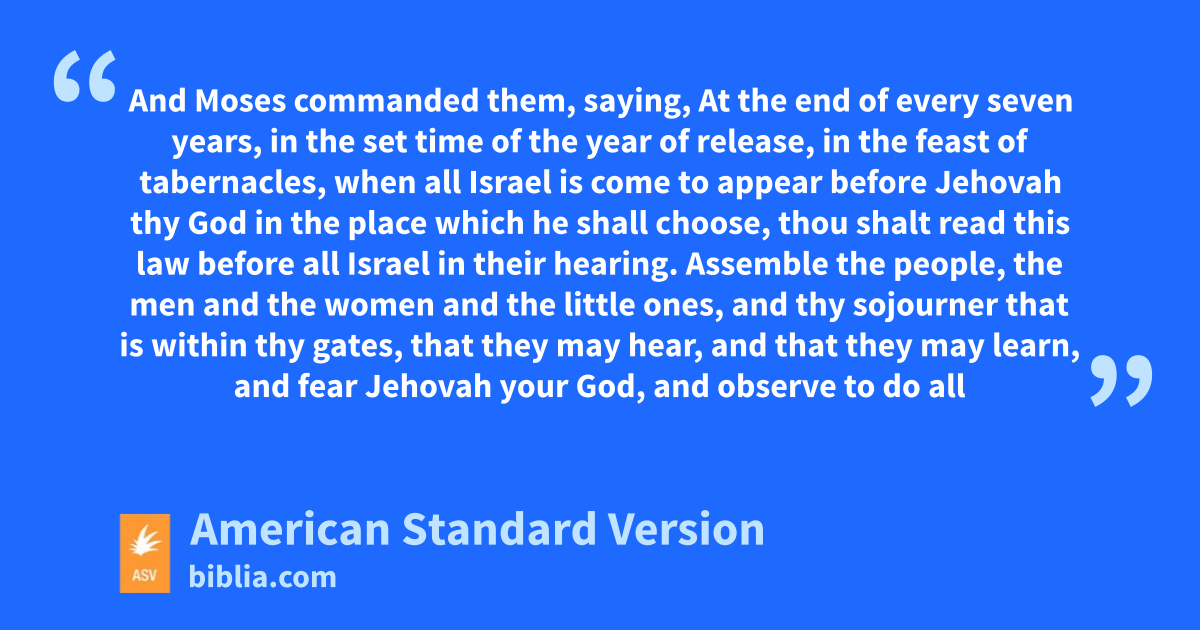 9And Moses wrote this law, and delivered it unto the priests the sons of Levi, that bare the ark of the covenant of Jehovah, and unto all the elders of Israel. 10And Moses commanded them, saying, At the end of every seven years, in the set time of the year of release, in the feast of tabernacles, 11when all Israel is come to appear before Jehovah thy God in the place which he shall choose, thou shalt read this law before all Israel in their hearing. 12Assemble the people, the men and the women and the little ones, and thy sojourner that is within thy gates, that they may hear, and that they may learn, and fear Jehovah your God, and observe to do all the words of this law; 13and that their children, who have not known, may hear, and learn to fear Jehovah your God, as long as ye live in the land whither ye go over the Jordan to possess it.
