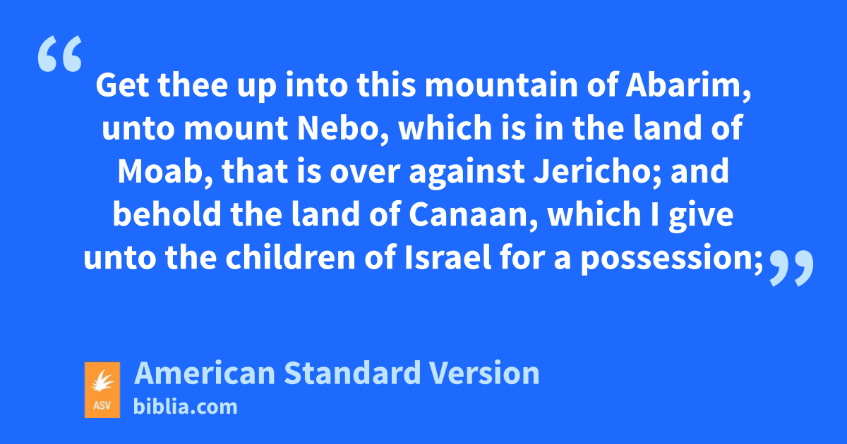 48And Jehovah spake unto Moses that selfsame day, saying, 49Get thee up into this mountain of Abarim, unto mount Nebo, which is in the land of Moab, that is over against Jericho; and behold the land of Canaan, which I give unto the children of Israel for a possession; 50and die in the mount whither thou goest up, and be gathered unto thy people, as Aaron thy brother died in mount Hor, and was gathered unto his people: 51because ye trespassed against me in the midst of the children of Israel at the waters of Meribah of Kadesh, in the wilderness of Zin; because ye sanctified me not in the midst of the children of Israel. 52For thou shalt see the land before thee; but thou shalt not go thither into the land which I give the children of Israel.