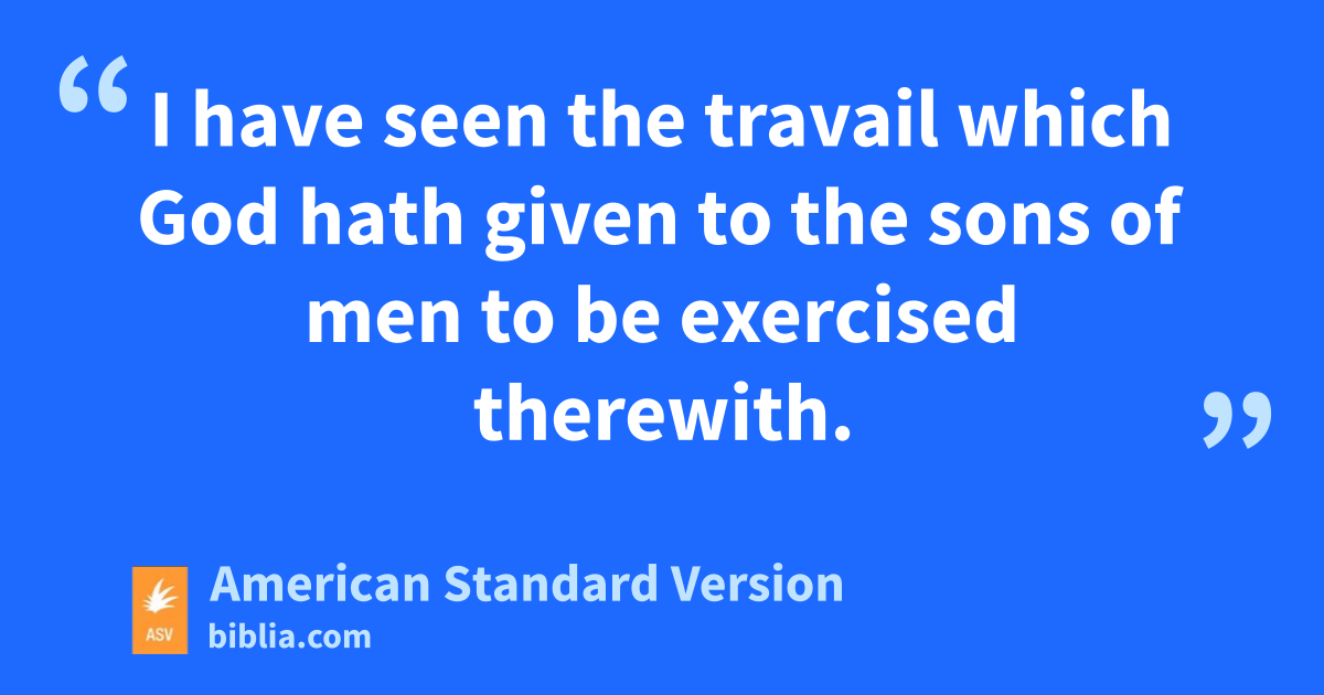 3 For everything there is a season, and a time for every purpose under heaven: 2a time to be born, and a time to die; a time to plant, and a time to pluck up that which is planted; 3a time to kill, and a time to heal; a time to break down, and a time to build up; 4a time to weep, and a time to laugh; a time to mourn, and a time to dance; 5a time to cast away stones, and a time to gather stones together; a time to embrace, and a time to refrain from embracing; 6a time to seek, and a time to lose; a time to keep, and a time to cast away; 7a time to rend, and a time to sew; a time to keep silence, and a time to speak; 8a time to love, and a time to hate; a time for war, and a time for peace. 9What profit hath he that worketh in that wherein he laboreth? 10I have seen the travail which God hath given to the sons of men to be exercised therewith. 11He hath made everything beautiful in its time: also he hath set eternity in their heart, yet so that man cannot find out the work that God hath done from the beginning even to the end. 12I know that there is nothing better for them, than to rejoice, and to do good so long as they live. 13And also that every man should eat and drink, and enjoy good in all his labor, is the gift of God. 14I know that, whatsoever God doeth, it shall be for ever: nothing can be put to it, nor anything taken from it; and God hath done it, that men should fear before him. 15That which is hath been long ago; and that which is to be hath long ago been: and God seeketh again that which is passed away.