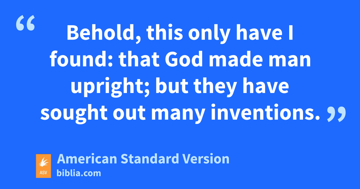 23All this have I proved in wisdom: I said, I will be wise; but it was far from me. 24That which is, is far off and exceeding deep; who can find it out? 25I turned about, and my heart was set to know and to search out, and to seek wisdom and the reason of things, and to know that wickedness is folly, and that foolishness is madness. 26And I find more bitter than death the woman whose heart is snares and nets, and whose hands are bands: whoso pleaseth God shall escape from her; but the sinner shall be taken by her. 27Behold, this have I found, saith the Preacher, laying one thing to another, to find out the account; 28which my soul still seeketh, but I have not found: one man among a thousand have I found; but a woman among all those have I not found. 29Behold, this only have I found: that God made man upright; but they have sought out many inventions.