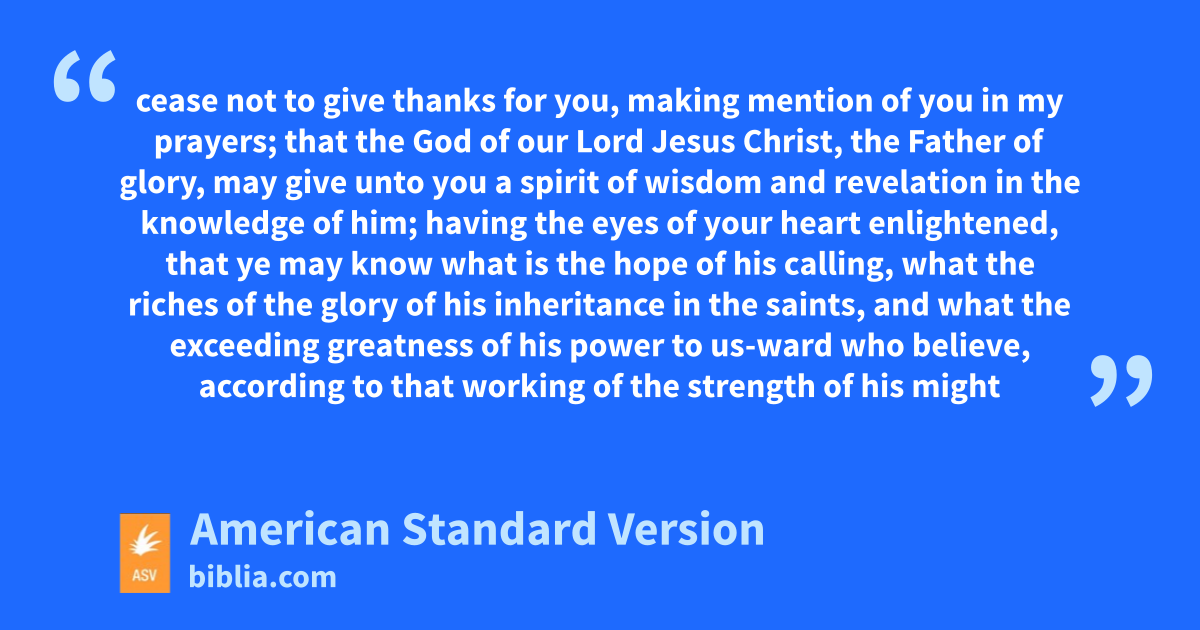 15For this cause I also, having heard of the faith in the Lord Jesus which is among you, and the love which ye show toward all the saints, 16cease not to give thanks for you, making mention of you in my prayers; 17that the God of our Lord Jesus Christ, the Father of glory, may give unto you a spirit of wisdom and revelation in the knowledge of him; 18having the eyes of your heart enlightened, that ye may know what is the hope of his calling, what the riches of the glory of his inheritance in the saints, 19and what the exceeding greatness of his power to us-ward who believe, according to that working of the strength of his might 20which he wrought in Christ, when he raised him from the dead, and made him to sit at his right hand in the heavenly places, 21far above all rule, and authority, and power, and dominion, and every name that is named, not only in this world, but also in that which is to come: 22and he put all things in subjection under his feet, and gave him to be head over all things to the church, 23which is his body, the fulness of him that filleth all in all.