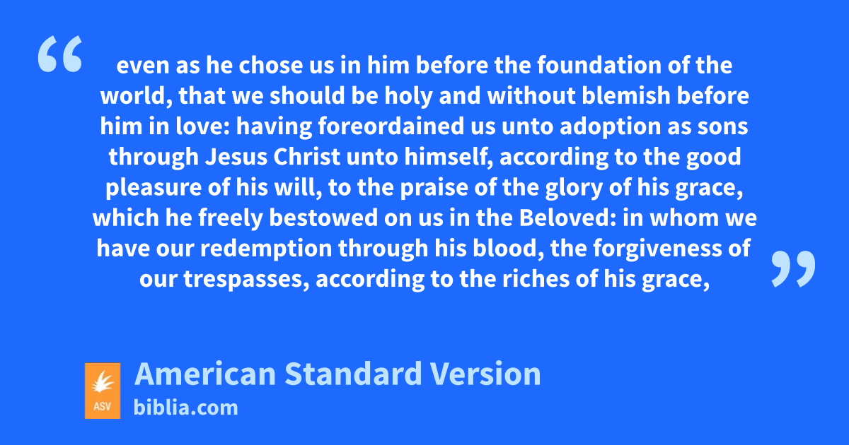 3Blessed be the God and Father of our Lord Jesus Christ, who hath blessed us with every spiritual blessing in the heavenly places in Christ: 4even as he chose us in him before the foundation of the world, that we should be holy and without blemish before him in love: 5having foreordained us unto adoption as sons through Jesus Christ unto himself, according to the good pleasure of his will, 6to the praise of the glory of his grace, which he freely bestowed on us in the Beloved: 7in whom we have our redemption through his blood, the forgiveness of our trespasses, according to the riches of his grace, 8which he made to abound toward us in all wisdom and prudence, 9making known unto us the mystery of his will, according to his good pleasure which he purposed in him 10unto a dispensation of the fulness of the times, to sum up all things in Christ, the things in the heavens, and the things upon the earth; in him, I say, 11in whom also we were made a heritage, having been foreordained according to the purpose of him who worketh all things after the counsel of his will; 12to the end that we should be unto the praise of his glory, we who had before hoped in Christ: 13in whom ye also, having heard the word of the truth, the gospel of your salvation,—in whom, having also believed, ye were sealed with the Holy Spirit of promise, 14which is an earnest of our inheritance, unto the redemption of God’s own possession, unto the praise of his glory.