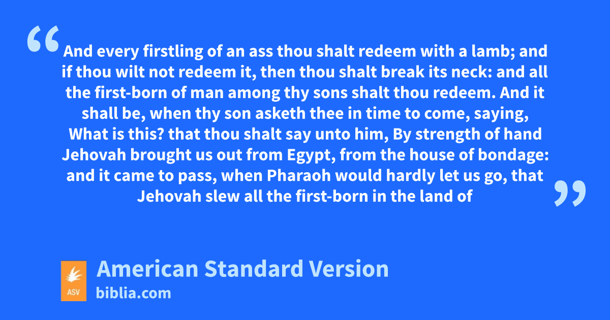 11And it shall be, when Jehovah shall bring thee into the land of the Canaanite, as he sware unto thee and to thy fathers, and shall give it thee, 12that thou shalt set apart unto Jehovah all that openeth the womb, and every firstling which thou hast that cometh of a beast; the males shall be Jehovah’s. 13And every firstling of an ass thou shalt redeem with a lamb; and if thou wilt not redeem it, then thou shalt break its neck: and all the first-born of man among thy sons shalt thou redeem. 14And it shall be, when thy son asketh thee in time to come, saying, What is this? that thou shalt say unto him, By strength of hand Jehovah brought us out from Egypt, from the house of bondage: 15and it came to pass, when Pharaoh would hardly let us go, that Jehovah slew all the first-born in the land of Egypt, both the first-born of man, and the first-born of beast: therefore I sacrifice to Jehovah all that openeth the womb, being males; but all the first-born of my sons I redeem. 16And it shall be for a sign upon thy hand, and for frontlets between thine eyes: for by strength of hand Jehovah brought us forth out of Egypt.