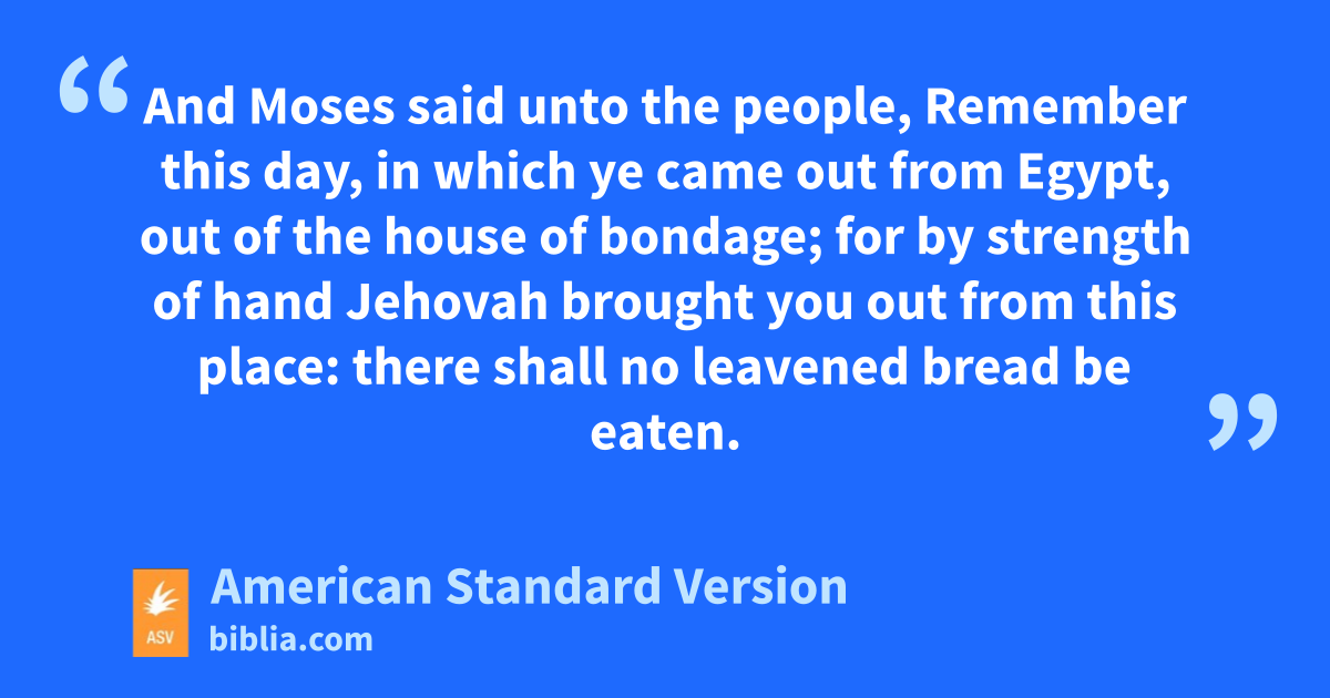 3And Moses said unto the people, Remember this day, in which ye came out from Egypt, out of the house of bondage; for by strength of hand Jehovah brought you out from this place: there shall no leavened bread be eaten. 4This day ye go forth in the month Abib. 5And it shall be, when Jehovah shall bring thee into the land of the Canaanite, and the Hittite, and the Amorite, and the Hivite, and the Jebusite, which he sware unto thy fathers to give thee, a land flowing with milk and honey, that thou shalt keep this service in this month. 6Seven days thou shalt eat unleavened bread, and in the seventh day shall be a feast to Jehovah. 7Unleavened bread shall be eaten throughout the seven days; and there shall no leavened bread be seen with thee, neither shall there be leaven seen with thee, in all thy borders. 8And thou shalt tell thy son in that day, saying, It is because of that which Jehovah did for me when I came forth out of Egypt. 9And it shall be for a sign unto thee upon thy hand, and for a memorial between thine eyes, that the law of Jehovah may be in thy mouth: for with a strong hand hath Jehovah brought thee out of Egypt. 10Thou shalt therefore keep this ordinance in its season from year to year.