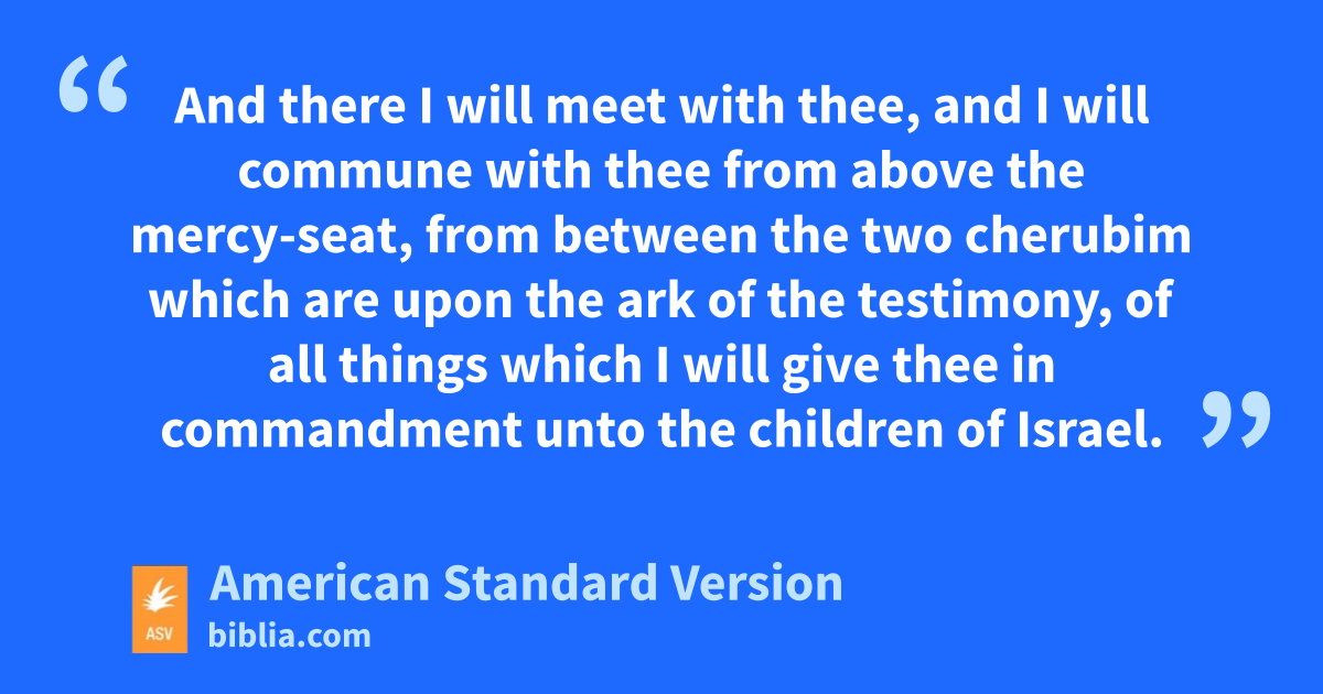 10And they shall make an ark of acacia wood: two cubits and a half shall be the length thereof, and a cubit and a half the breadth thereof, and a cubit and a half the height thereof. 11And thou shalt overlay it with pure gold, within and without shalt thou overlay it, and shalt make upon it a crown of gold round about. 12And thou shalt cast four rings of gold for it, and put them in the four feet thereof; and two rings shall be on the one side of it, and two rings on the other side of it. 13And thou shalt make staves of acacia wood, and overlay them with gold. 14And thou shalt put the staves into the rings on the sides of the ark, wherewith to bear the ark. 15The staves shall be in the rings of the ark: they shall not be taken from it. 16And thou shalt put into the ark the testimony which I shall give thee. 17And thou shalt make a mercy-seat of pure gold: two cubits and a half shall be the length thereof, and a cubit and a half the breadth thereof. 18And thou shalt make two cherubim of gold; of beaten work shalt thou make them, at the two ends of the mercy-seat. 19And make one cherub at the one end, and one cherub at the other end: of one piece with the mercy-seat shall ye make the cherubim on the two ends thereof. 20And the cherubim shall spread out their wings on high, covering the mercy-seat with their wings, with their faces one to another; toward the mercy-seat shall the faces of the cherubim be. 21And thou shalt put the mercy-seat above upon the ark; and in the ark thou shalt put the testimony that I shall give thee. 22And there I will meet with thee, and I will commune with thee from above the mercy-seat, from between the two cherubim which are upon the ark of the testimony, of all things which I will give thee in commandment unto the children of Israel.