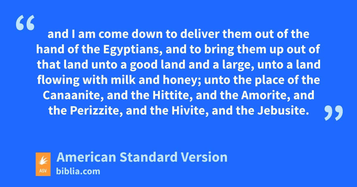 3 Now Moses was keeping the flock of Jethro his father-in-law, the priest of Midian: and he led the flock to the back of the wilderness, and came to the mountain of God, unto Horeb. 2And the angel of Jehovah appeared unto him in a flame of fire out of the midst of a bush: and he looked, and, behold, the bush burned with fire, and the bush was not consumed. 3And Moses said, I will turn aside now, and see this great sight, why the bush is not burnt. 4And when Jehovah saw that he turned aside to see, God called unto him out of the midst of the bush, and said, Moses, Moses. And he said, Here am I. 5And he said, Draw not nigh hither: put off thy shoes from off thy feet, for the place whereon thou standest is holy ground. 6Moreover he said, I am the God of thy father, the God of Abraham, the God of Isaac, and the God of Jacob. And Moses hid his face; for he was afraid to look upon God. 7And Jehovah said, I have surely seen the affliction of my people that are in Egypt, and have heard their cry by reason of their taskmasters; for I know their sorrows; 8and I am come down to deliver them out of the hand of the Egyptians, and to bring them up out of that land unto a good land and a large, unto a land flowing with milk and honey; unto the place of the Canaanite, and the Hittite, and the Amorite, and the Perizzite, and the Hivite, and the Jebusite. 9And now, behold, the cry of the children of Israel is come unto me: moreover I have seen the oppression wherewith the Egyptians oppress them. 10Come now therefore, and I will send thee unto Pharaoh, that thou mayest bring forth my people the children of Israel out of Egypt. 11And Moses said unto God, Who am I, that I should go unto Pharaoh, and that I should bring forth the children of Israel out of Egypt? 12And he said, Certainly I will be with thee; and this shall be the token unto thee, that I have sent thee: when thou hast brought forth the people out of Egypt, ye shall serve God upon this mountain.