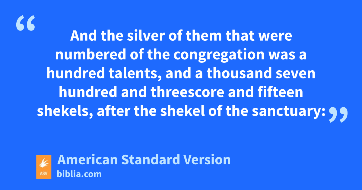 24All the gold that was used for the work in all the work of the sanctuary, even the gold of the offering, was twenty and nine talents, and seven hundred and thirty shekels, after the shekel of the sanctuary. 25And the silver of them that were numbered of the congregation was a hundred talents, and a thousand seven hundred and threescore and fifteen shekels, after the shekel of the sanctuary: 26a beka a head, that is, half a shekel, after the shekel of the sanctuary, for every one that passed over to them that were numbered, from twenty years old and upward, for six hundred thousand and three thousand and five hundred and fifty men. 27And the hundred talents of silver were for casting the sockets of the sanctuary, and the sockets of the veil; a hundred sockets for the hundred talents, a talent for a socket. 28And of the thousand seven hundred seventy and five shekels he made hooks for the pillars, and overlaid their capitals, and made fillets for them. 29And the brass of the offering was seventy talents, and two thousand and four hundred shekels. 30And therewith he made the sockets to the door of the tent of meeting, and the brazen altar, and the brazen grating for it, and all the vessels of the altar, 31and the sockets of the court round about, and the sockets of the gate of the court, and all the pins of the tabernacle, and all the pins of the court round about.