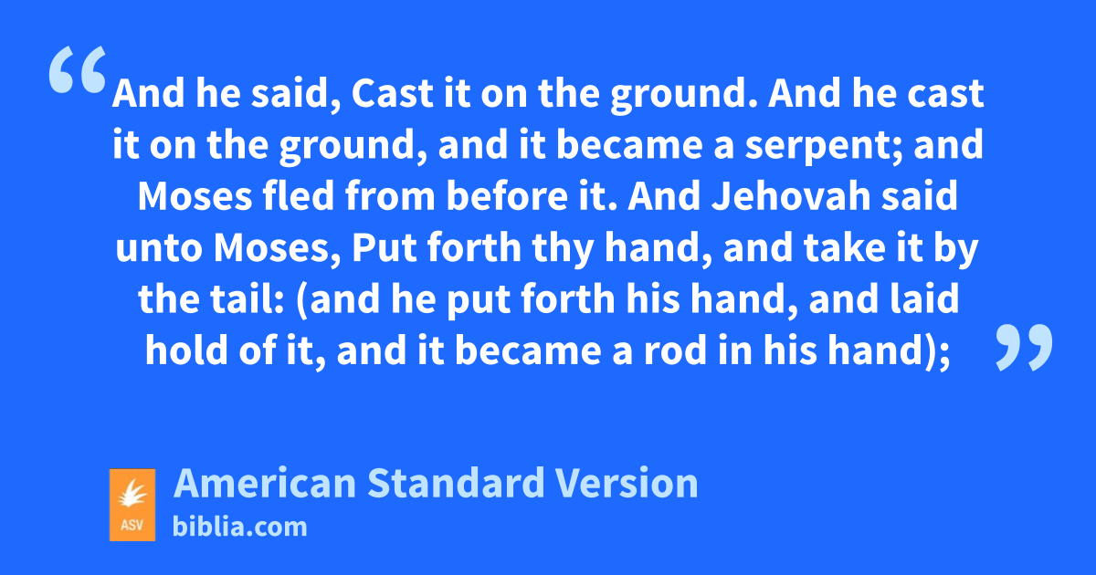 4 And Moses answered and said, But, behold, they will not believe me, nor hearken unto my voice; for they will say, Jehovah hath not appeared unto thee. 2And Jehovah said unto him, What is that in thy hand? And he said, A rod. 3And he said, Cast it on the ground. And he cast it on the ground, and it became a serpent; and Moses fled from before it. 4And Jehovah said unto Moses, Put forth thy hand, and take it by the tail: (and he put forth his hand, and laid hold of it, and it became a rod in his hand); 5that they may believe that Jehovah, the God of their fathers, the God of Abraham, the God of Isaac, and the God of Jacob, hath appeared unto thee. 6And Jehovah said furthermore unto him, Put now thy hand into thy bosom. And he put his hand into his bosom: and when he took it out, behold, his hand was leprous, as white as snow. 7And he said, Put thy hand into thy bosom again. (And he put his hand into his bosom again; and when he took it out of his bosom, behold, it was turned again as his other flesh.) 8And it shall come to pass, if they will not believe thee, neither hearken to the voice of the first sign, that they will believe the voice of the latter sign. 9And it shall come to pass, if they will not believe even these two signs, neither hearken unto thy voice, that thou shalt take of the water of the river, and pour it upon the dry land: and the water which thou takest out of the river shall become blood upon the dry land.