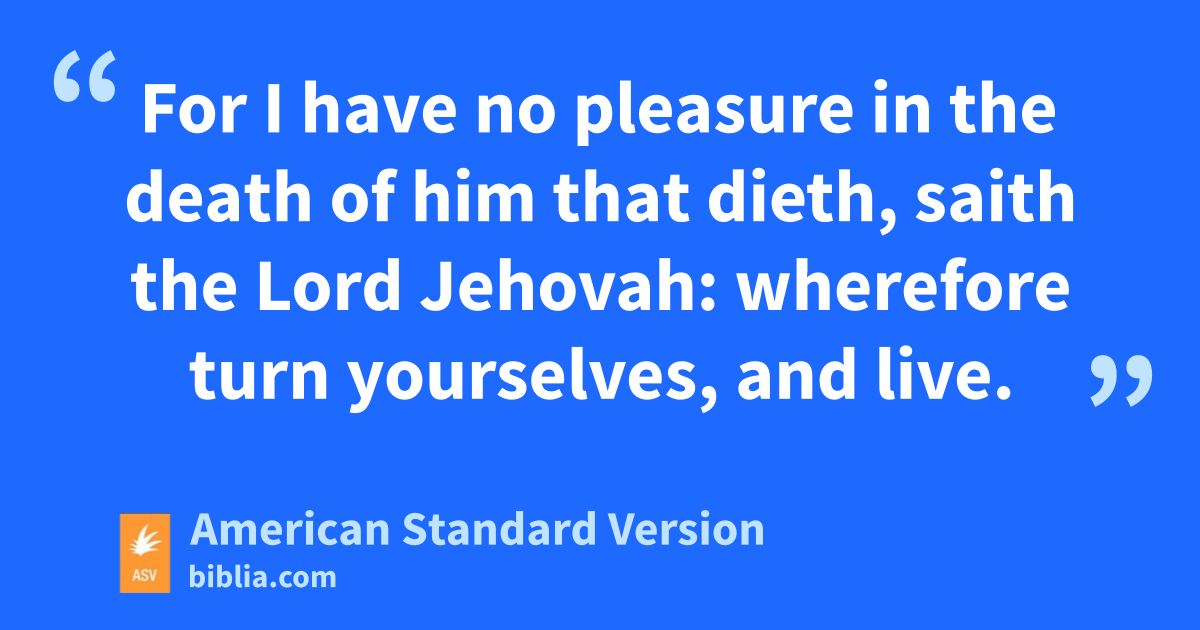 25Yet ye say, The way of the Lord is not equal. Hear now, O house of Israel: Is not my way equal? are not your ways unequal? 26When the righteous man turneth away from his righteousness, and committeth iniquity, and dieth therein; in his iniquity that he hath done shall he die. 27Again, when the wicked man turneth away from his wickedness that he hath committed, and doeth that which is lawful and right, he shall save his soul alive. 28Because he considereth, and turneth away from all his transgressions that he hath committed, he shall surely live, he shall not die. 29Yet saith the house of Israel, The way of the Lord is not equal. O house of Israel, are not my ways equal? are not your ways unequal? 30Therefore I will judge you, O house of Israel, every one according to his ways, saith the Lord Jehovah. Return ye, and turn yourselves from all your transgressions; so iniquity shall not be your ruin. 31Cast away from you all your transgressions, wherein ye have transgressed; and make you a new heart and a new spirit: for why will ye die, O house of Israel? 32For I have no pleasure in the death of him that dieth, saith the Lord Jehovah: wherefore turn yourselves, and live.