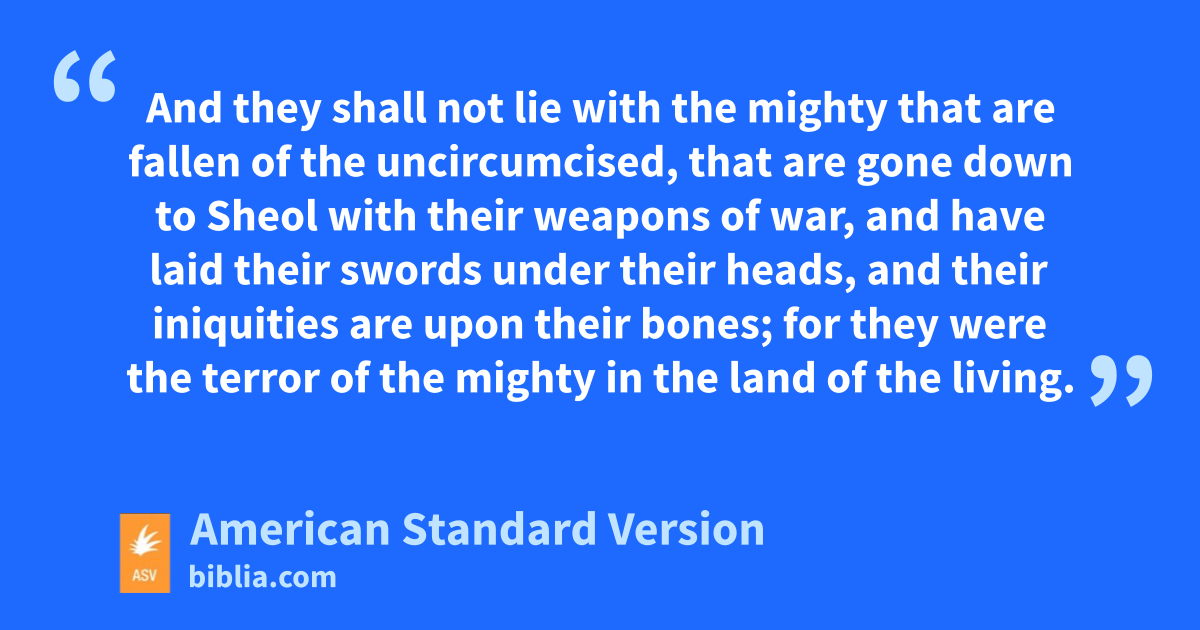 26There is Meshech, Tubal, and all their multitude; their graves are round about them; all of them uncircumcised, slain by the sword; for they caused their terror in the land of the living. 27And they shall not lie with the mighty that are fallen of the uncircumcised, that are gone down to Sheol with their weapons of war, and have laid their swords under their heads, and their iniquities are upon their bones; for they were the terror of the mighty in the land of the living. 28But thou shalt be broken in the midst of the uncircumcised, and shalt lie with them that are slain by the sword.