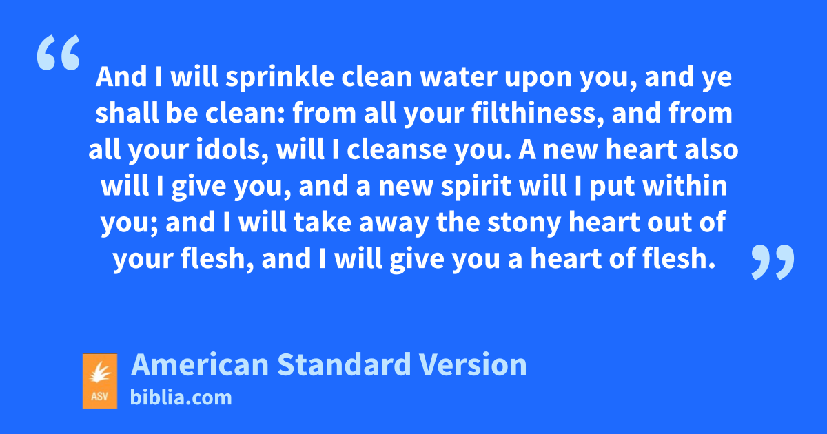 22Therefore say unto the house of Israel, Thus saith the Lord Jehovah: I do not this for your sake, O house of Israel, but for my holy name, which ye have profaned among the nations, whither ye went. 23And I will sanctify my great name, which hath been profaned among the nations, which ye have profaned in the midst of them; and the nations shall know that I am Jehovah, saith the Lord Jehovah, when I shall be sanctified in you before their eyes. 24For I will take you from among the nations, and gather you out of all the countries, and will bring you into your own land. 25And I will sprinkle clean water upon you, and ye shall be clean: from all your filthiness, and from all your idols, will I cleanse you. 26A new heart also will I give you, and a new spirit will I put within you; and I will take away the stony heart out of your flesh, and I will give you a heart of flesh. 27And I will put my Spirit within you, and cause you to walk in my statutes, and ye shall keep mine ordinances, and do them. 28And ye shall dwell in the land that I gave to your fathers; and ye shall be my people, and I will be your God. 29And I will save you from all your uncleannesses: and I will call for the grain, and will multiply it, and lay no famine upon you. 30And I will multiply the fruit of the tree, and the increase of the field, that ye may receive no more the reproach of famine among the nations. 31Then shall ye remember your evil ways, and your doings that were not good; and ye shall loathe yourselves in your own sight for your iniquities and for your abominations.