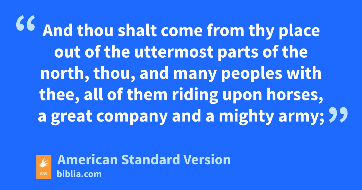 14Therefore, son of man, prophesy, and say unto Gog, Thus saith the Lord Jehovah: In that day when my people Israel dwelleth securely, shalt thou not know it? 15And thou shalt come from thy place out of the uttermost parts of the north, thou, and many peoples with thee, all of them riding upon horses, a great company and a mighty army; 16and thou shalt come up against my people Israel, as a cloud to cover the land: it shall come to pass in the latter days, that I will bring thee against my land, that the nations may know me, when I shall be sanctified in thee, O Gog, before their eyes.