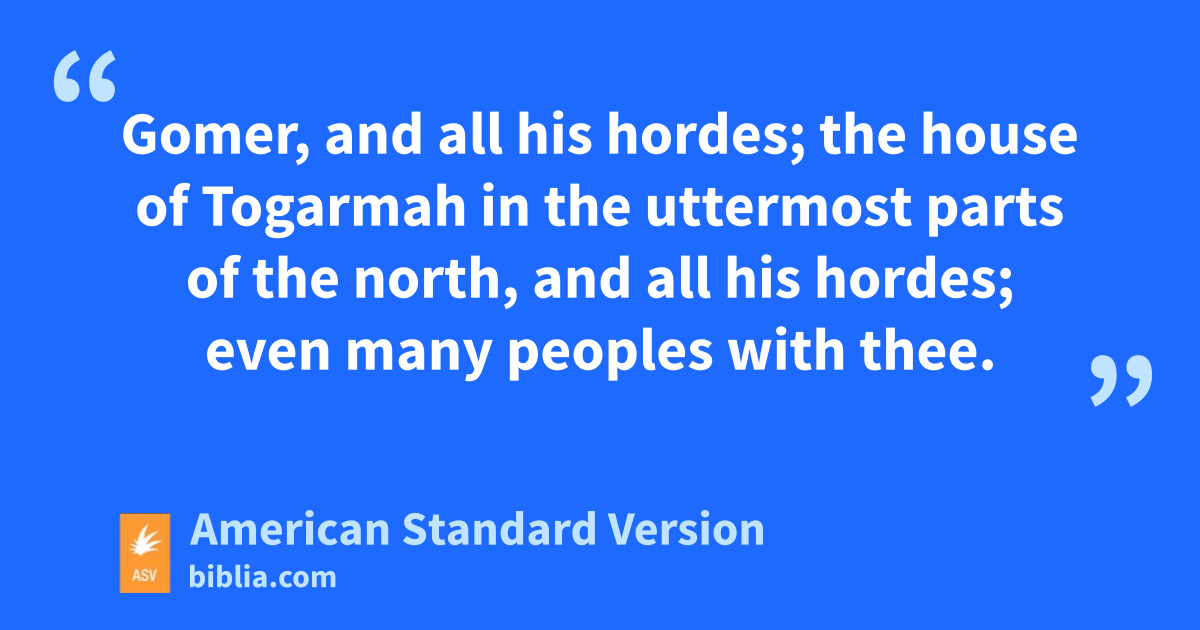 38 And the word of Jehovah came unto me, saying, 2Son of man, set thy face toward Gog, of the land of Magog, the prince of Rosh, Meshech, and Tubal, and prophesy against him, 3and say, Thus saith the Lord Jehovah: Behold, I am against thee, O Gog, prince of Rosh, Meshech, and Tubal: 4and I will turn thee about, and put hooks into thy jaws, and I will bring thee forth, and all thine army, horses and horsemen, all of them clothed in full armor, a great company with buckler and shield, all of them handling swords; 5Persia, Cush, and Put with them, all of them with shield and helmet; 6Gomer, and all his hordes; the house of Togarmah in the uttermost parts of the north, and all his hordes; even many peoples with thee.