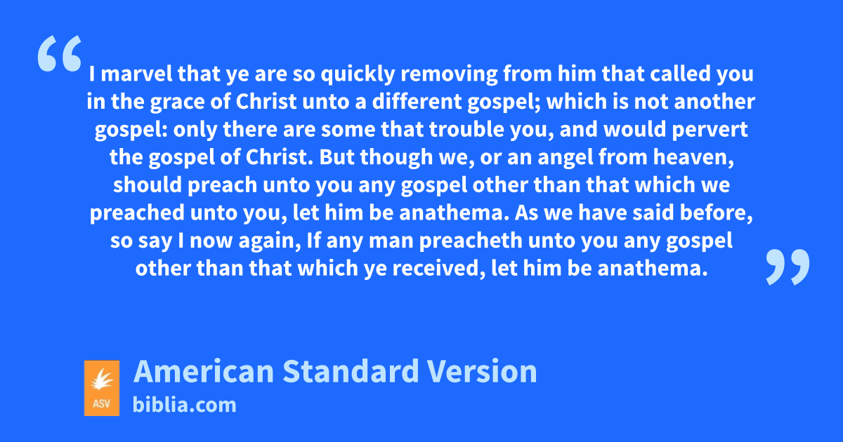 6I marvel that ye are so quickly removing from him that called you in the grace of Christ unto a different gospel; 7which is not another gospel: only there are some that trouble you, and would pervert the gospel of Christ. 8But though we, or an angel from heaven, should preach unto you any gospel other than that which we preached unto you, let him be anathema. 9As we have said before, so say I now again, If any man preacheth unto you any gospel other than that which ye received, let him be anathema. 10For am I now seeking the favor of men, or of God? or am I striving to please men? if I were still pleasing men, I should not be a servant of Christ.