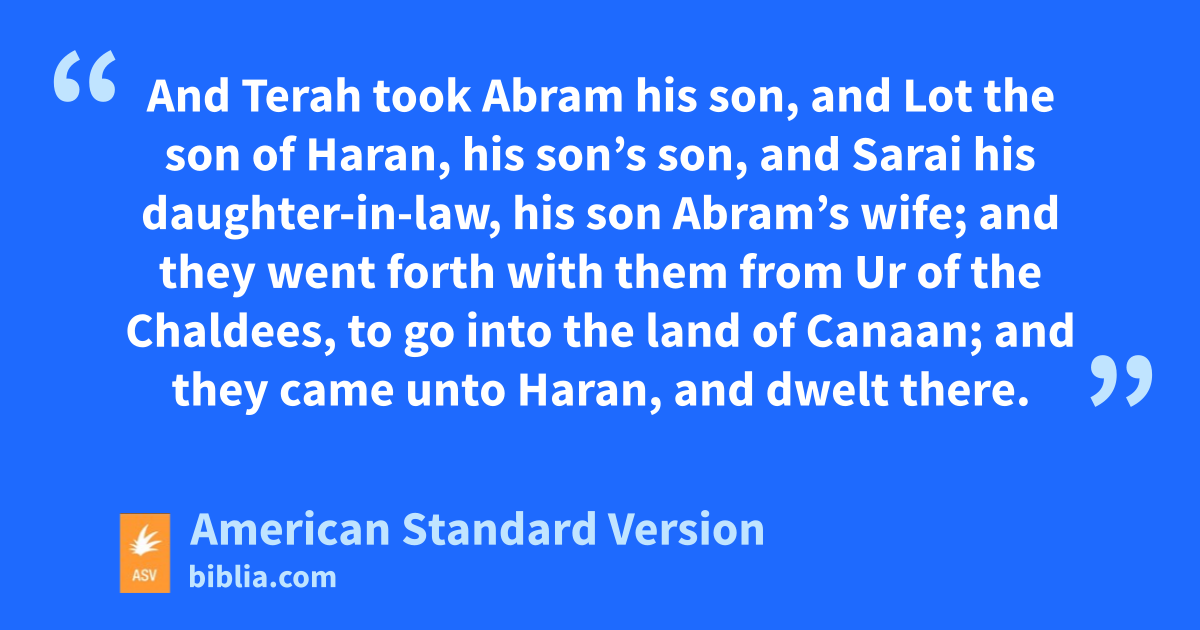 27Now these are the generations of Terah. Terah begat Abram, Nahor, and Haran; and Haran begat Lot. 28And Haran died before his father Terah in the land of his nativity, in Ur of the Chaldees. 29And Abram and Nahor took them wives: the name of Abram’s wife was Sarai; and the name of Nahor’s wife, Milcah, the daughter of Haran, the father of Milcah, and the father of Iscah. 30And Sarai was barren; she had no child. 31And Terah took Abram his son, and Lot the son of Haran, his son’s son, and Sarai his daughter-in-law, his son Abram’s wife; and they went forth with them from Ur of the Chaldees, to go into the land of Canaan; and they came unto Haran, and dwelt there. 32And the days of Terah were two hundred and five years: and Terah died in Haran.