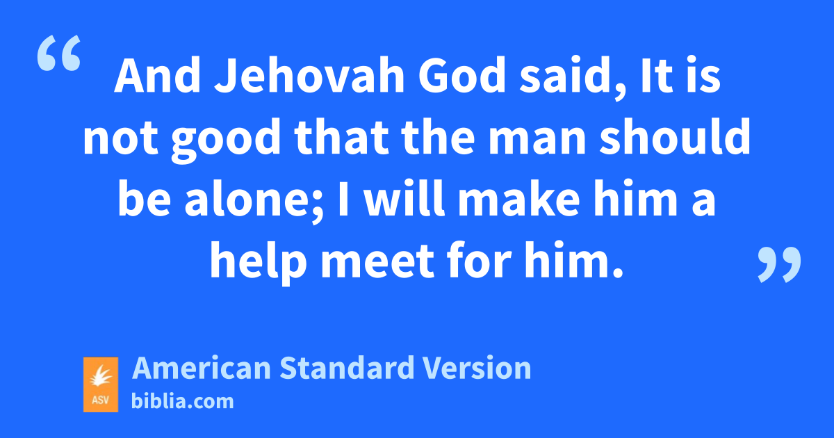 18And Jehovah God said, It is not good that the man should be alone; I will make him a help meet for him. 19And out of the ground Jehovah God formed every beast of the field, and every bird of the heavens; and brought them unto the man to see what he would call them: and whatsoever the man called every living creature, that was the name thereof. 20And the man gave names to all cattle, and to the birds of the heavens, and to every beast of the field; but for man there was not found a help meet for him. 21And Jehovah God caused a deep sleep to fall upon the man, and he slept; and he took one of his ribs, and closed up the flesh instead thereof: 22and the rib, which Jehovah God had taken from the man, made he a woman, and brought her unto the man. 23And the man said, This is now bone of my bones, and flesh of my flesh: she shall be called Woman, because she was taken out of Man. 24Therefore shall a man leave his father and his mother, and shall cleave unto his wife: and they shall be one flesh. 25And they were both naked, the man and his wife, and were not ashamed.