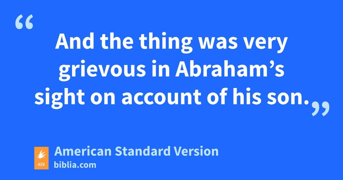 8And the child grew, and was weaned: and Abraham made a great feast on the day that Isaac was weaned. 9And Sarah saw the son of Hagar the Egyptian, whom she had borne unto Abraham, mocking. 10Wherefore she said unto Abraham, Cast out this handmaid and her son: for the son of this handmaid shall not be heir with my son, even with Isaac. 11And the thing was very grievous in Abraham’s sight on account of his son. 12And God said unto Abraham, Let it not be grievous in thy sight because of the lad, and because of thy handmaid; in all that Sarah saith unto thee, hearken unto her voice; for in Isaac shall thy seed be called. 13And also of the son of the handmaid will I make a nation, because he is thy seed. 14And Abraham rose up early in the morning, and took bread and a bottle of water, and gave it unto Hagar, putting it on her shoulder, and gave her the child, and sent her away: and she departed, and wandered in the wilderness of Beer-sheba. 15And the water in the bottle was spent, and she cast the child under one of the shrubs. 16And she went, and sat her down over against him a good way off, as it were a bowshot: for she said, Let me not look upon the death of the child. And she sat over against him, and lifted up her voice, and wept. 17And God heard the voice of the lad; and the angel of God called to Hagar out of heaven, and said unto her, What aileth thee, Hagar? fear not; for God hath heard the voice of the lad where he is. 18Arise, lift up the lad, and hold him in thy hand; for I will make him a great nation. 19And God opened her eyes, and she saw a well of water; and she went, and filled the bottle with water, and gave the lad drink. 20And God was with the lad, and he grew; and he dwelt in the wilderness, and became, as he grew up, an archer. 21And he dwelt in the wilderness of Paran: and his mother took him a wife out of the land of Egypt.