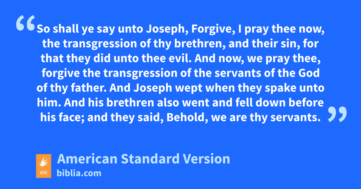 15And when Joseph’s brethren saw that their father was dead, they said, It may be that Joseph will hate us, and will fully requite us all the evil which we did unto him. 16And they sent a message unto Joseph, saying, Thy father did command before he died, saying, 17So shall ye say unto Joseph, Forgive, I pray thee now, the transgression of thy brethren, and their sin, for that they did unto thee evil. And now, we pray thee, forgive the transgression of the servants of the God of thy father. And Joseph wept when they spake unto him. 18And his brethren also went and fell down before his face; and they said, Behold, we are thy servants. 19And Joseph said unto them, Fear not: for am I in the place of God? 20And as for you, ye meant evil against me; but God meant it for good, to bring to pass, as it is this day, to save much people alive. 21Now therefore fear ye not: I will nourish you, and your little ones. And he comforted them, and spake kindly unto them.