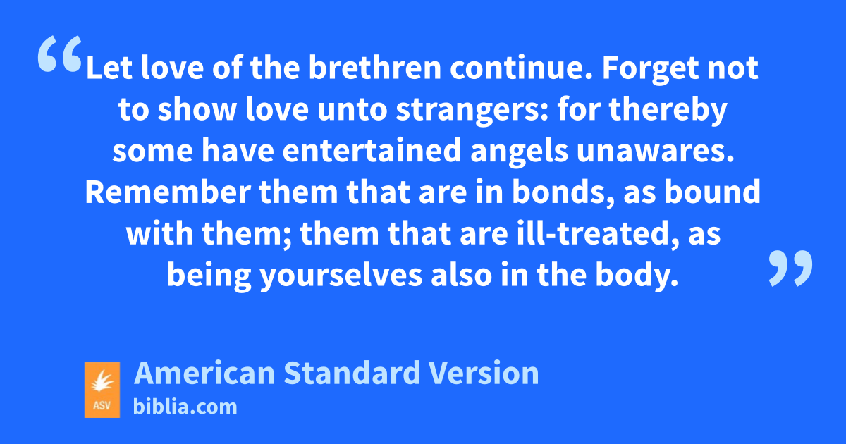13 Let love of the brethren continue. 2Forget not to show love unto strangers: for thereby some have entertained angels unawares. 3Remember them that are in bonds, as bound with them; them that are ill-treated, as being yourselves also in the body. 4Let marriage be had in honor among all, and let the bed be undefiled: for fornicators and adulterers God will judge. 5Be ye free from the love of money; content with such things as ye have: for himself hath said, I will in no wise fail thee, neither will I in any wise forsake thee. 6So that with good courage we say,