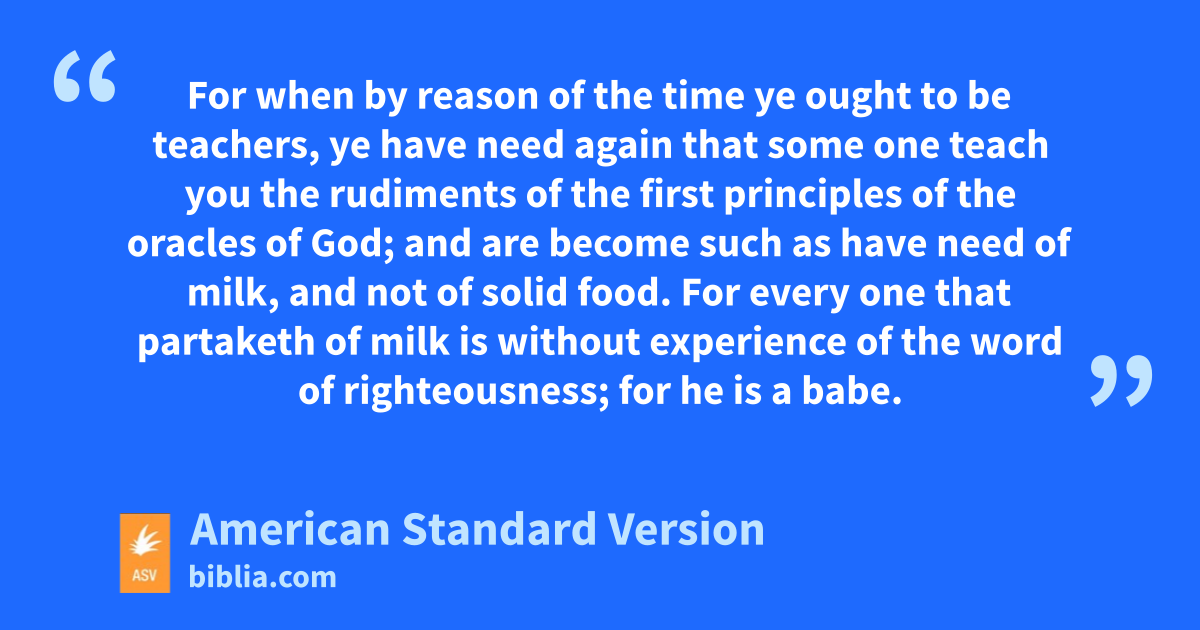 11Of whom we have many things to say, and hard of interpretation, seeing ye are become dull of hearing. 12For when by reason of the time ye ought to be teachers, ye have need again that some one teach you the rudiments of the first principles of the oracles of God; and are become such as have need of milk, and not of solid food. 13For every one that partaketh of milk is without experience of the word of righteousness; for he is a babe. 14But solid food is for fullgrown men, even those who by reason of use have their senses exercised to discern good and evil.