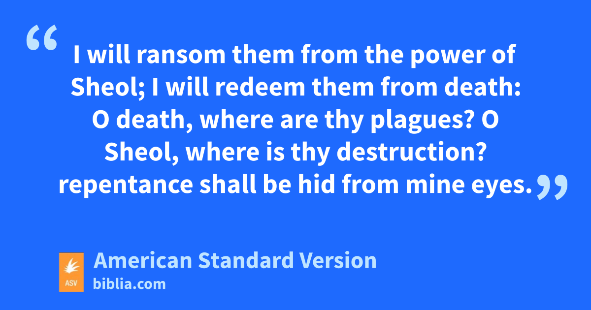9It is thy destruction, O Israel, that thou art against me, against thy help. 10Where now is thy king, that he may save thee in all thy cities? and thy judges, of whom thou saidst, Give me a king and princes? 11I have given thee a king in mine anger, and have taken him away in my wrath. 12The iniquity of Ephraim is bound up; his sin is laid up in store. 13The sorrows of a travailing woman shall come upon him: he is an unwise son; for it is time he should not tarry in the place of the breaking forth of children. 14I will ransom them from the power of Sheol; I will redeem them from death: O death, where are thy plagues? O Sheol, where is thy destruction? repentance shall be hid from mine eyes.