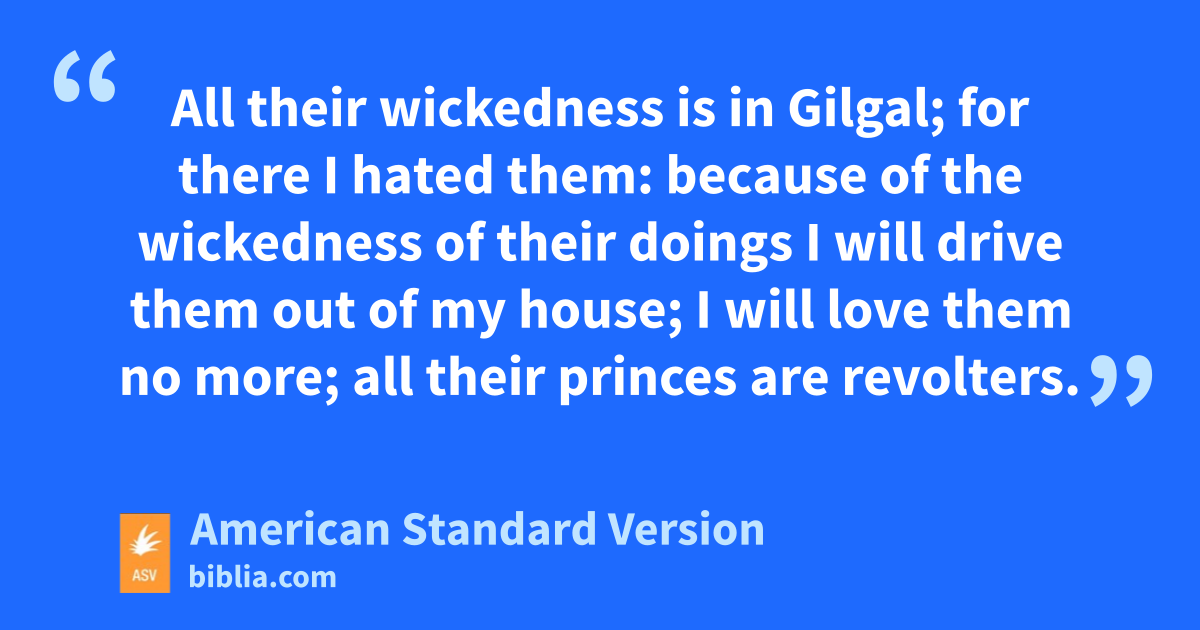 10I found Israel like grapes in the wilderness; I saw your fathers as the first-ripe in the fig-tree at its first season: but they came to Baal-peor, and consecrated themselves unto the shameful thing, and became abominable like that which they loved. 11As for Ephraim, their glory shall fly away like a bird: there shall be no birth, and none with child, and no conception. 12Though they bring up their children, yet will I bereave them, so that not a man shall be left: yea, woe also to them when I depart from them! 13Ephraim, like as I have seen Tyre, is planted in a pleasant place: but Ephraim shall bring out his children to the slayer. 14Give them, O Jehovah—what wilt thou give? give them a miscarrying womb and dry breasts. 15All their wickedness is in Gilgal; for there I hated them: because of the wickedness of their doings I will drive them out of my house; I will love them no more; all their princes are revolters. 16Ephraim is smitten, their root is dried up, they shall bear no fruit: yea, though they bring forth, yet will I slay the beloved fruit of their womb. 17My God will cast them away, because they did not hearken unto him; and they shall be wanderers among the nations.