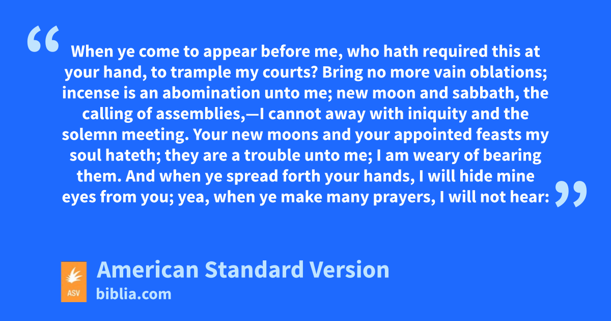 10Hear the word of Jehovah, ye rulers of Sodom; give ear unto the law of our God, ye people of Gomorrah. 11What unto me is the multitude of your sacrifices? saith Jehovah: I have had enough of the burnt-offerings of rams, and the fat of fed beasts; and I delight not in the blood of bullocks, or of lambs, or of he-goats. 12When ye come to appear before me, who hath required this at your hand, to trample my courts? 13Bring no more vain oblations; incense is an abomination unto me; new moon and sabbath, the calling of assemblies,—I cannot away with iniquity and the solemn meeting. 14Your new moons and your appointed feasts my soul hateth; they are a trouble unto me; I am weary of bearing them. 15And when ye spread forth your hands, I will hide mine eyes from you; yea, when ye make many prayers, I will not hear: your hands are full of blood. 16Wash you, make you clean; put away the evil of your doings from before mine eyes; cease to do evil; 17learn to do well; seek justice, relieve the oppressed, judge the fatherless, plead for the widow.