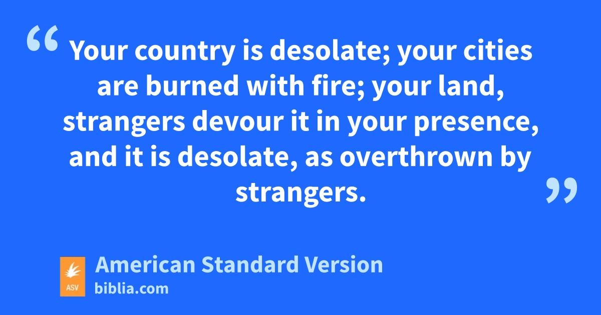 2Hear, O heavens, and give ear, O earth; for Jehovah hath spoken: I have nourished and brought up children, and they have rebelled against me. 3The ox knoweth his owner, and the ass his master’s crib; but Israel doth not know, my people doth not consider. 4Ah sinful nation, a people laden with iniquity, a seed of evil-doers, children that deal corruptly! they have forsaken Jehovah, they have despised the Holy One of Israel, they are estranged and gone backward. 5Why will ye be still stricken, that ye revolt more and more? the whole head is sick, and the whole heart faint. 6From the sole of the foot even unto the head there is no soundness in it; but wounds, and bruises, and fresh stripes: they have not been closed, neither bound up, neither mollified with oil. 7Your country is desolate; your cities are burned with fire; your land, strangers devour it in your presence, and it is desolate, as overthrown by strangers. 8And the daughter of Zion is left as a booth in a vineyard, as a lodge in a garden of cucumbers, as a besieged city. 9Except Jehovah of hosts had left unto us a very small remnant, we should have been as Sodom, we should have been like unto Gomorrah.