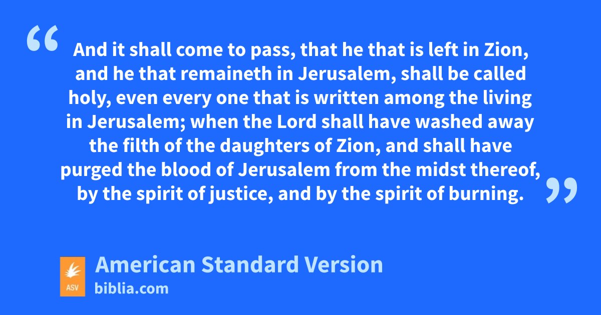2In that day shall the branch of Jehovah be beautiful and glorious, and the fruit of the land shall be excellent and comely for them that are escaped of Israel. 3And it shall come to pass, that he that is left in Zion, and he that remaineth in Jerusalem, shall be called holy, even every one that is written among the living in Jerusalem; 4when the Lord shall have washed away the filth of the daughters of Zion, and shall have purged the blood of Jerusalem from the midst thereof, by the spirit of justice, and by the spirit of burning. 5And Jehovah will create over the whole habitation of mount Zion, and over her assemblies, a cloud and smoke by day, and the shining of a flaming fire by night; for over all the glory shall be spread a covering. 6And there shall be a pavilion for a shade in the day-time from the heat, and for a refuge and for a covert from storm and from rain.