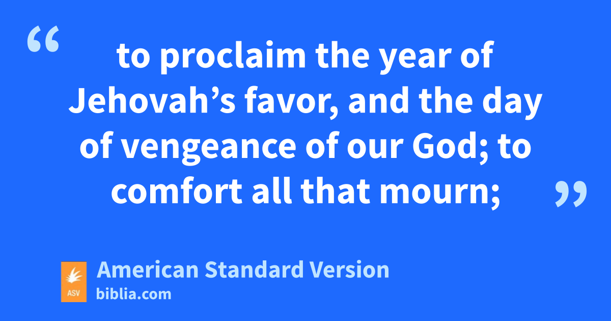 61 The Spirit of the Lord Jehovah is upon me; because Jehovah hath anointed me to preach good tidings unto the meek; he hath sent me to bind up the broken-hearted, to proclaim liberty to the captives, and the opening of the prison to them that are bound; 2to proclaim the year of Jehovah’s favor, and the day of vengeance of our God; to comfort all that mourn; 3to appoint unto them that mourn in Zion, to give unto them a garland for ashes, the oil of joy for mourning, the garment of praise for the spirit of heaviness; that they may be called trees of righteousness, the planting of Jehovah, that he may be glorified.