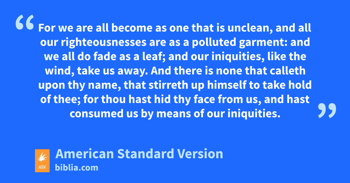 64 Oh that thou wouldest rend the heavens, that thou wouldest come down, that the mountains might quake at thy presence, 2as when fire kindleth the brushwood, and the fire causeth the waters to boil; to make thy name known to thine adversaries, that the nations may tremble at thy presence! 3When thou didst terrible things which we looked not for, thou camest down, the mountains quaked at thy presence. 4For from of old men have not heard, nor perceived by the ear, neither hath the eye seen a God besides thee, who worketh for him that waiteth for him. 5Thou meetest him that rejoiceth and worketh righteousness, those that remember thee in thy ways: behold, thou wast wroth, and we sinned: in them have we been of long time; and shall we be saved? 6For we are all become as one that is unclean, and all our righteousnesses are as a polluted garment: and we all do fade as a leaf; and our iniquities, like the wind, take us away. 7And there is none that calleth upon thy name, that stirreth up himself to take hold of thee; for thou hast hid thy face from us, and hast consumed us by means of our iniquities.