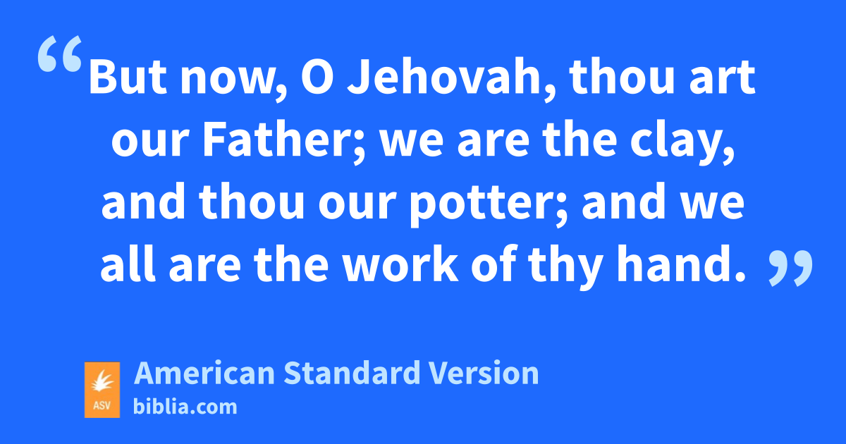 8But now, O Jehovah, thou art our Father; we are the clay, and thou our potter; and we all are the work of thy hand. 9Be not wroth very sore, O Jehovah, neither remember iniquity for ever: behold, look, we beseech thee, we are all thy people. 10Thy holy cities are become a wilderness, Zion is become a wilderness, Jerusalem a desolation. 11Our holy and our beautiful house, where our fathers praised thee, is burned with fire; and all our pleasant places are laid waste. 12Wilt thou refrain thyself for these things, O Jehovah? wilt thou hold thy peace, and afflict us very sore?
