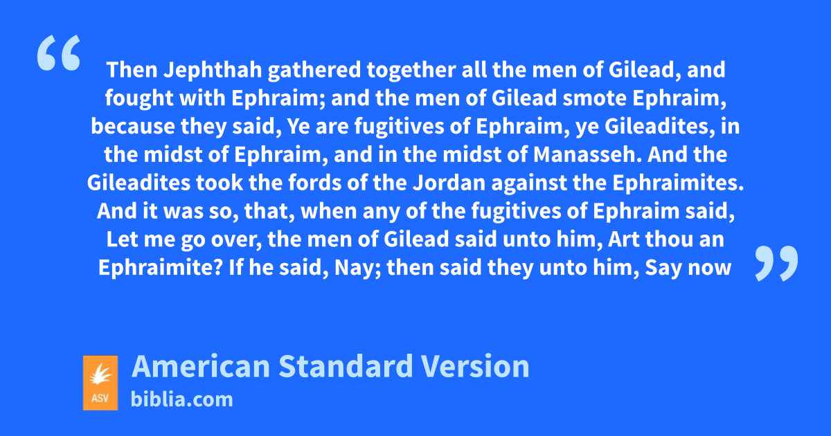 12 And the men of Ephraim were gathered together, and passed northward; and they said unto Jephthah, Wherefore passedst thou over to fight against the children of Ammon, and didst not call us to go with thee? we will burn thy house upon thee with fire. 2And Jephthah said unto them, I and my people were at great strife with the children of Ammon; and when I called you, ye saved me not out of their hand. 3And when I saw that ye saved me not, I put my life in my hand, and passed over against the children of Ammon, and Jehovah delivered them into my hand: wherefore then are ye come up unto me this day, to fight against me? 4Then Jephthah gathered together all the men of Gilead, and fought with Ephraim; and the men of Gilead smote Ephraim, because they said, Ye are fugitives of Ephraim, ye Gileadites, in the midst of Ephraim, and in the midst of Manasseh. 5And the Gileadites took the fords of the Jordan against the Ephraimites. And it was so, that, when any of the fugitives of Ephraim said, Let me go over, the men of Gilead said unto him, Art thou an Ephraimite? If he said, Nay; 6then said they unto him, Say now Shibboleth; and he said Sibboleth; for he could not frame to pronounce it right: then they laid hold on him, and slew him at the fords of the Jordan. And there fell at that time of Ephraim forty and two thousand.