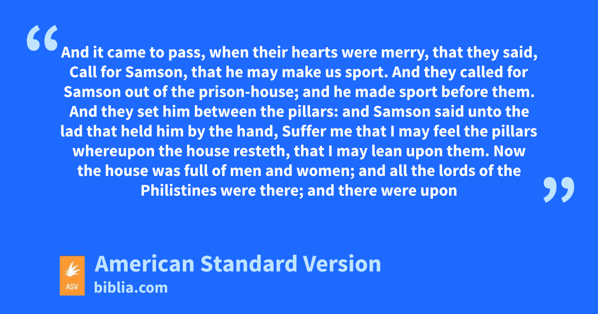 23And the lords of the Philistines gathered them together to offer a great sacrifice unto Dagon their god, and to rejoice; for they said, Our god hath delivered Samson our enemy into our hand. 24And when the people saw him, they praised their god; for they said, Our god hath delivered into our hand our enemy, and the destroyer of our country, who hath slain many of us. 25And it came to pass, when their hearts were merry, that they said, Call for Samson, that he may make us sport. And they called for Samson out of the prison-house; and he made sport before them. And they set him between the pillars: 26and Samson said unto the lad that held him by the hand, Suffer me that I may feel the pillars whereupon the house resteth, that I may lean upon them. 27Now the house was full of men and women; and all the lords of the Philistines were there; and there were upon the roof about three thousand men and women, that beheld while Samson made sport.