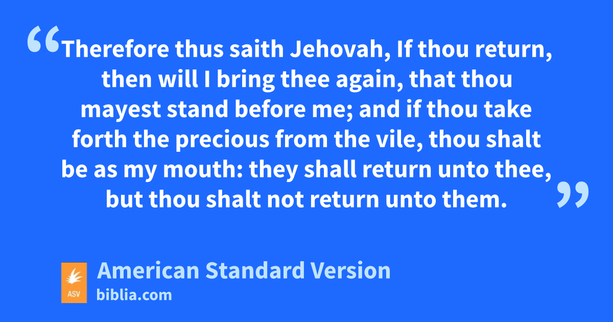 19Therefore thus saith Jehovah, If thou return, then will I bring thee again, that thou mayest stand before me; and if thou take forth the precious from the vile, thou shalt be as my mouth: they shall return unto thee, but thou shalt not return unto them. 20And I will make thee unto this people a fortified brazen wall; and they shall fight against thee, but they shall not prevail against thee; for I am with thee to save thee and to deliver thee, saith Jehovah. 21And I will deliver thee out of the hand of the wicked, and I will redeem thee out of the hand of the terrible.