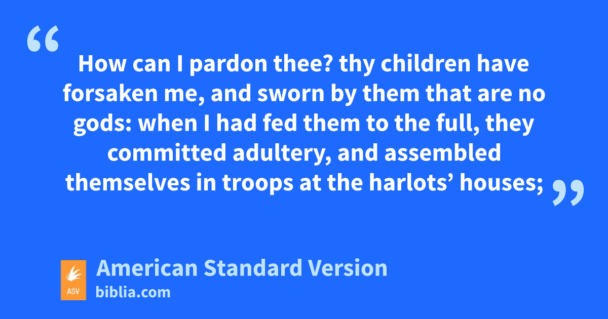 7How can I pardon thee? thy children have forsaken me, and sworn by them that are no gods: when I had fed them to the full, they committed adultery, and assembled themselves in troops at the harlots’ houses; 8they were as fed horses roaming at large; every one neighed after his neighbor’s wife. 9Shall I not visit for these things? saith Jehovah; and shall not my soul be avenged on such a nation as this?