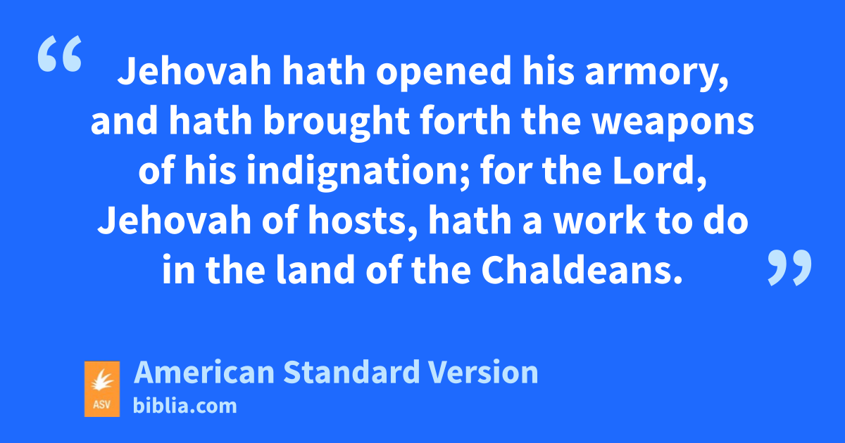 21Go up against the land of Merathaim, even against it, and against the inhabitants of Pekod: slay and utterly destroy after them, saith Jehovah, and do according to all that I have commanded thee. 22A sound of battle is in the land, and of great destruction. 23How is the hammer of the whole earth cut asunder and broken! how is Babylon become a desolation among the nations! 24I have laid a snare for thee, and thou art also taken, O Babylon, and thou wast not aware: thou art found, and also caught, because thou hast striven against Jehovah. 25Jehovah hath opened his armory, and hath brought forth the weapons of his indignation; for the Lord, Jehovah of hosts, hath a work to do in the land of the Chaldeans. 26Come against her from the utmost border; open her store-houses; cast her up as heaps, and destroy her utterly; let nothing of her be left. 27Slay all her bullocks; let them go down to the slaughter: woe unto them! for their day is come, the time of their visitation. 28The voice of them that flee and escape out of the land of Babylon, to declare in Zion the vengeance of Jehovah our God, the vengeance of his temple.