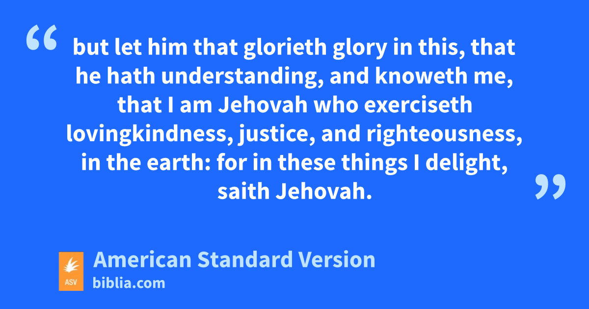 23Thus saith Jehovah, Let not the wise man glory in his wisdom, neither let the mighty man glory in his might, let not the rich man glory in his riches; 24but let him that glorieth glory in this, that he hath understanding, and knoweth me, that I am Jehovah who exerciseth lovingkindness, justice, and righteousness, in the earth: for in these things I delight, saith Jehovah.