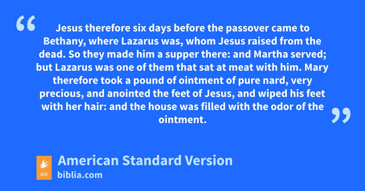 12 Jesus therefore six days before the passover came to Bethany, where Lazarus was, whom Jesus raised from the dead. 2So they made him a supper there: and Martha served; but Lazarus was one of them that sat at meat with him. 3Mary therefore took a pound of ointment of pure nard, very precious, and anointed the feet of Jesus, and wiped his feet with her hair: and the house was filled with the odor of the ointment. 4But Judas Iscariot, one of his disciples, that should betray him, saith, 5Why was not this ointment sold for three hundred shillings, and given to the poor? 6Now this he said, not because he cared for the poor; but because he was a thief, and having the bag took away what was put therein. 7Jesus therefore said, Suffer her to keep it against the day of my burying. 8For the poor ye have always with you; but me ye have not always.