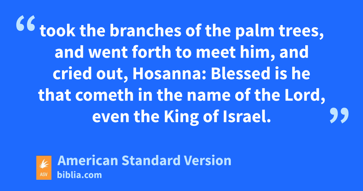 12On the morrow a great multitude that had come to the feast, when they heard that Jesus was coming to Jerusalem, 13took the branches of the palm trees, and went forth to meet him, and cried out, Hosanna: Blessed is he that cometh in the name of the Lord, even the King of Israel. 14And Jesus, having found a young ass, sat thereon; as it is written, 15Fear not, daughter of Zion: behold, thy King cometh, sitting on an ass’s colt. 16These things understood not his disciples at the first: but when Jesus was glorified, then remembered they that these things were written of him, and that they had done these things unto him. 17The multitude therefore that was with him when he called Lazarus out of the tomb, and raised him from the dead, bare witness. 18For this cause also the multitude went and met him, for that they heard that he had done this sign. 19The Pharisees therefore said among themselves, Behold how ye prevail nothing: lo, the world is gone after him.