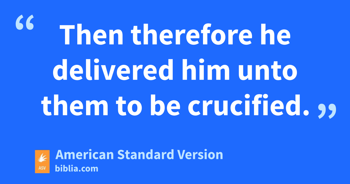 19 Then Pilate therefore took Jesus, and scourged him. 2And the soldiers platted a crown of thorns, and put it on his head, and arrayed him in a purple garment; 3and they came unto him, and said, Hail, King of the Jews! and they struck him with their hands. 4And Pilate went out again, and saith unto them, Behold, I bring him out to you, that ye may know that I find no crime in him. 5Jesus therefore came out, wearing the crown of thorns and the purple garment. And Pilate saith unto them, Behold, the man! 6When therefore the chief priests and the officers saw him, they cried out, saying, Crucify him, crucify him! Pilate saith unto them, Take him yourselves, and crucify him: for I find no crime in him. 7The Jews answered him, We have a law, and by that law he ought to die, because he made himself the Son of God. 8When Pilate therefore heard this saying, he was the more afraid; 9and he entered into the Praetorium again, and saith unto Jesus, Whence art thou? But Jesus gave him no answer. 10Pilate therefore saith unto him, Speakest thou not unto me? knowest thou not that I have power to release thee, and have power to crucify thee? 11Jesus answered him, Thou wouldest have no power against me, except it were given thee from above: therefore he that delivered me unto thee hath greater sin. 12Upon this Pilate sought to release him: but the Jews cried out, saying, If thou release this man, thou art not Caesar’s friend: every one that maketh himself a king speaketh against Caesar. 13When Pilate therefore heard these words, he brought Jesus out, and sat down on the judgment-seat at a place called The Pavement, but in Hebrew, Gabbatha. 14Now it was the Preparation of the passover: it was about the sixth hour. And he saith unto the Jews, Behold, your King! 15They therefore cried out, Away with him, away with him, crucify him! Pilate saith unto them, Shall I crucify your King? The chief priests answered, We have no king but Caesar. 16Then therefore he delivered him unto them to be crucified.