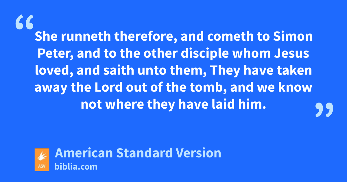 20 Now on the first day of the week cometh Mary Magdalene early, while it was yet dark, unto the tomb, and seeth the stone taken away from the tomb. 2She runneth therefore, and cometh to Simon Peter, and to the other disciple whom Jesus loved, and saith unto them, They have taken away the Lord out of the tomb, and we know not where they have laid him. 3Peter therefore went forth, and the other disciple, and they went toward the tomb. 4And they ran both together: and the other disciple outran Peter, and came first to the tomb; 5and stooping and looking in, he seeth the linen cloths lying; yet entered he not in. 6Simon Peter therefore also cometh, following him, and entered into the tomb; and he beholdeth the linen cloths lying, 7and the napkin, that was upon his head, not lying with the linen cloths, but rolled up in a place by itself. 8Then entered in therefore the other disciple also, who came first to the tomb, and he saw, and believed. 9For as yet they knew not the scripture, that he must rise again from the dead. 10So the disciples went away again unto their own home.